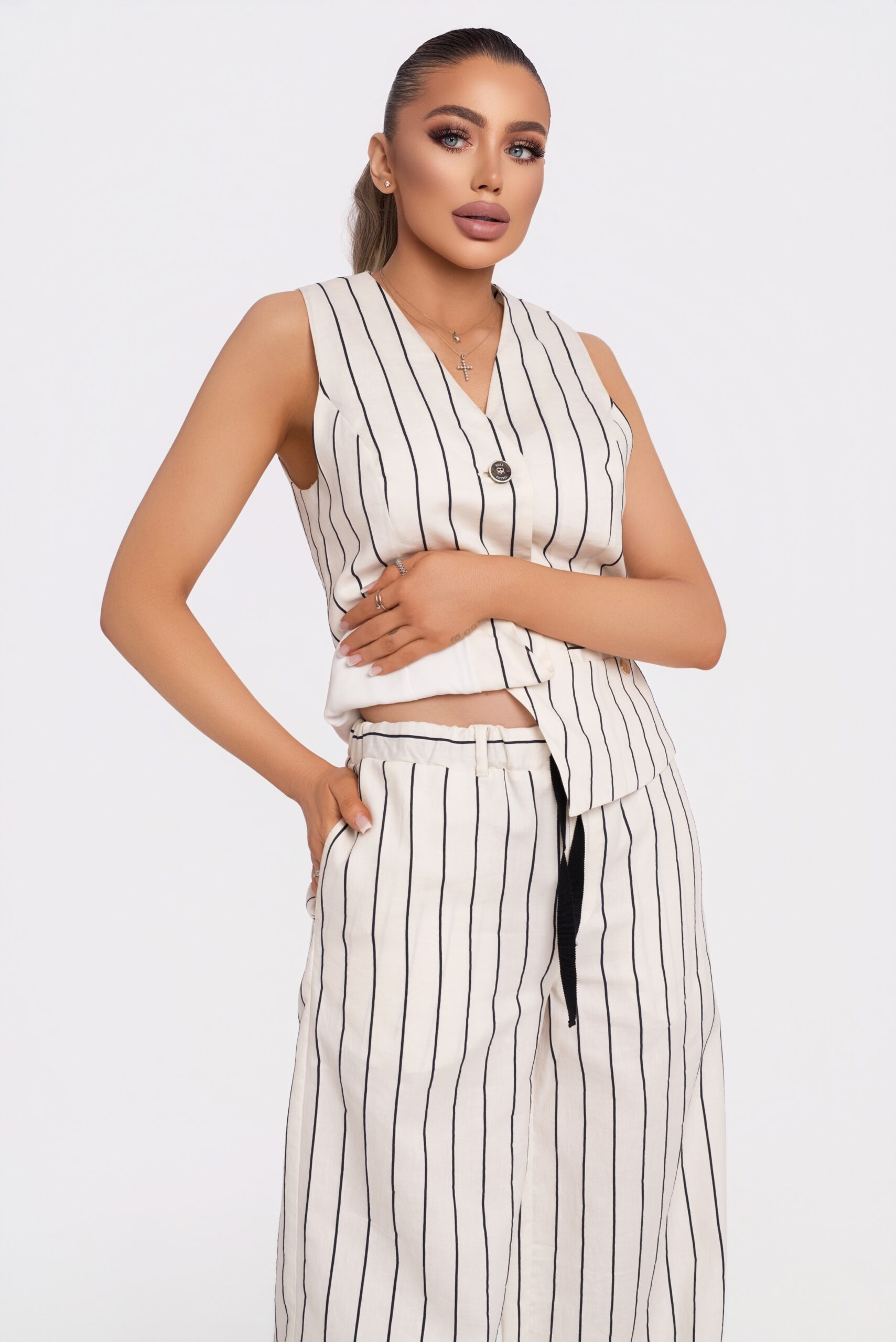 Елегантен, прецизно скроен елек, изработен от 100% висококачествен бял лен с фини черни райета.
