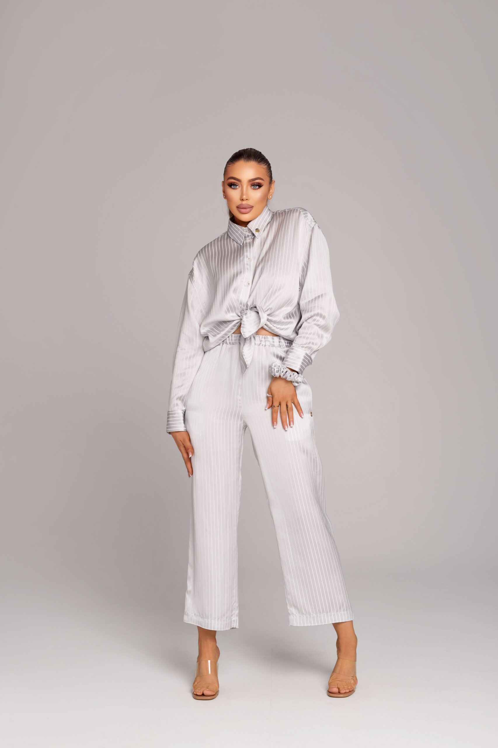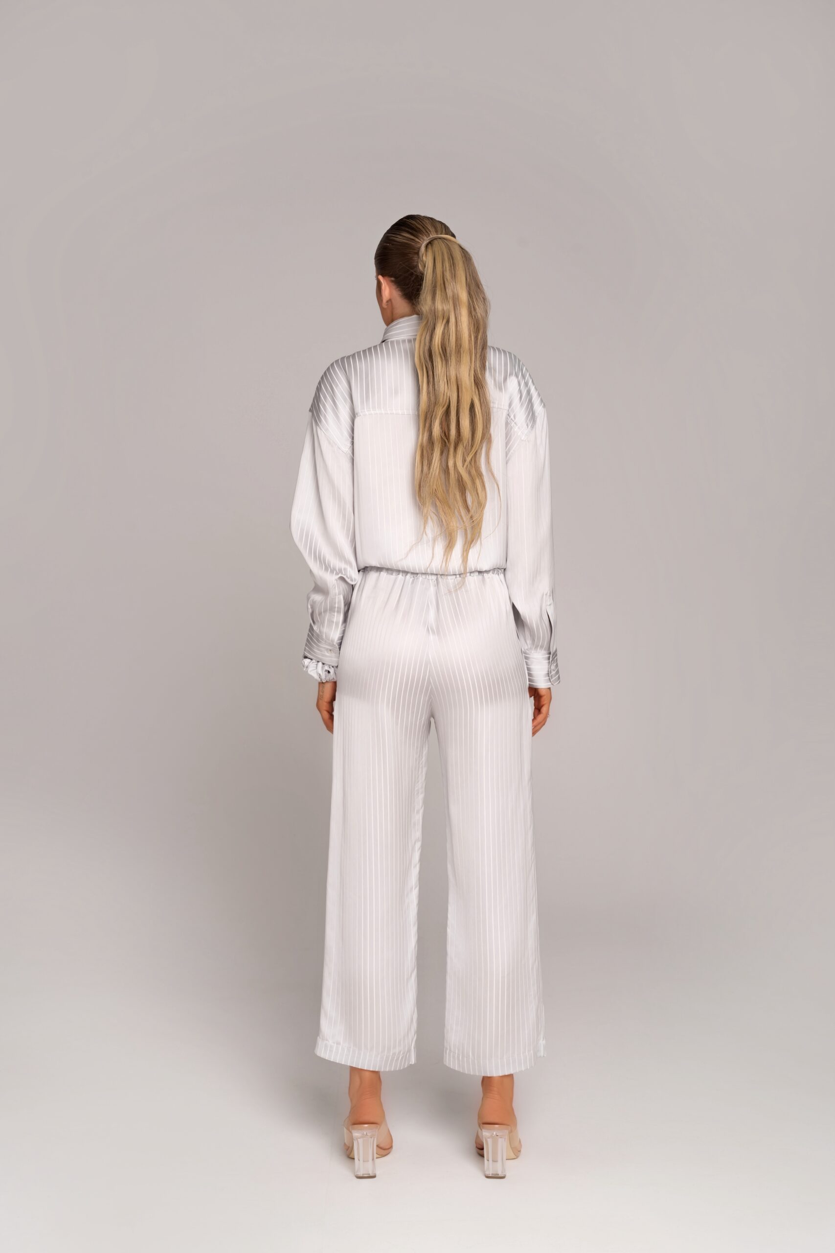 Панталонът се съчетава безупречно с ризата от същия сет, създавайки хармонична визия с подчертана елегантност и ненатрапчив лукс.