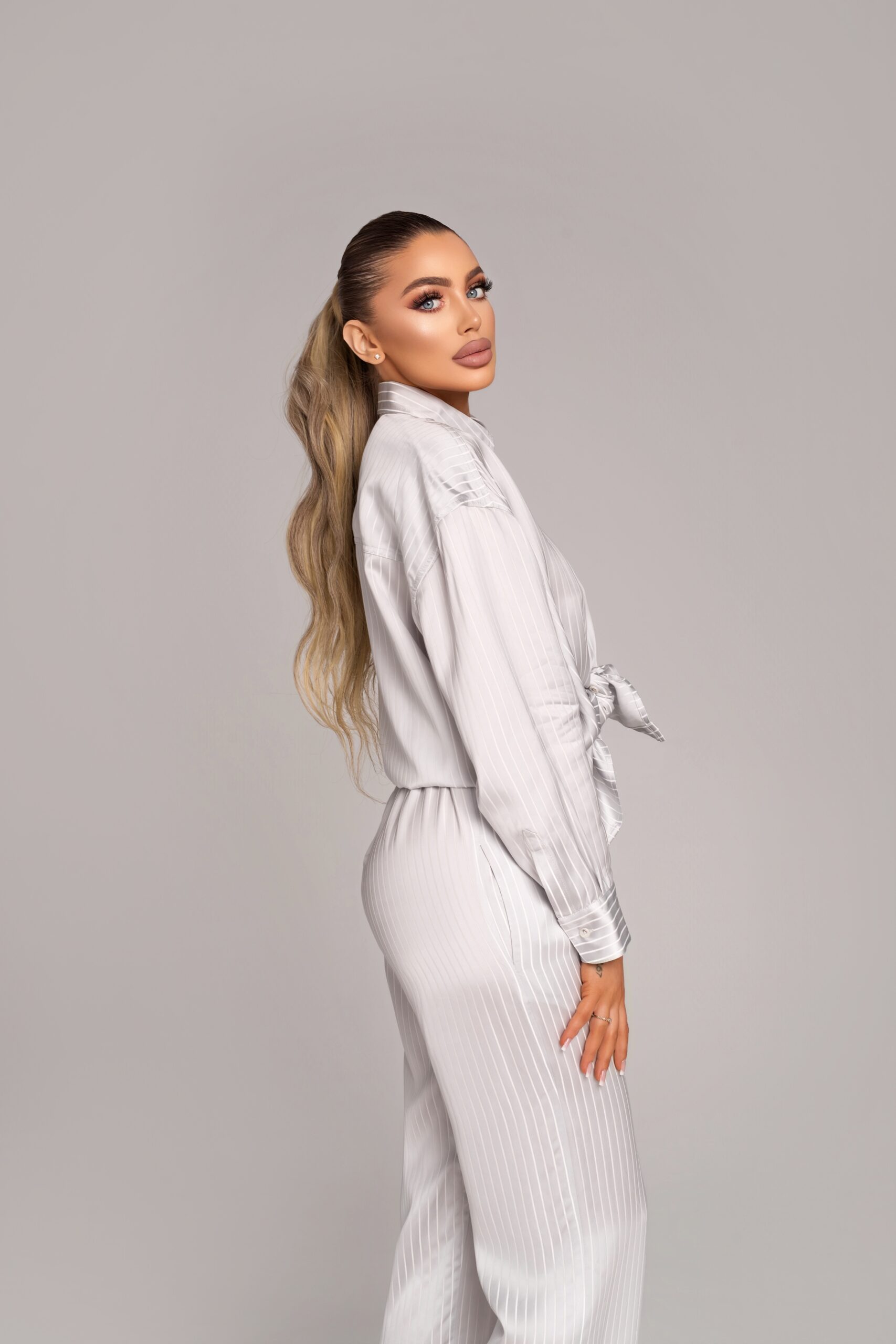 Елегантен панталон с прецизно изчистена линия, изработен от 100% луксозен раиран сатен с фин блясък и изключително гладко, копринено усещане.