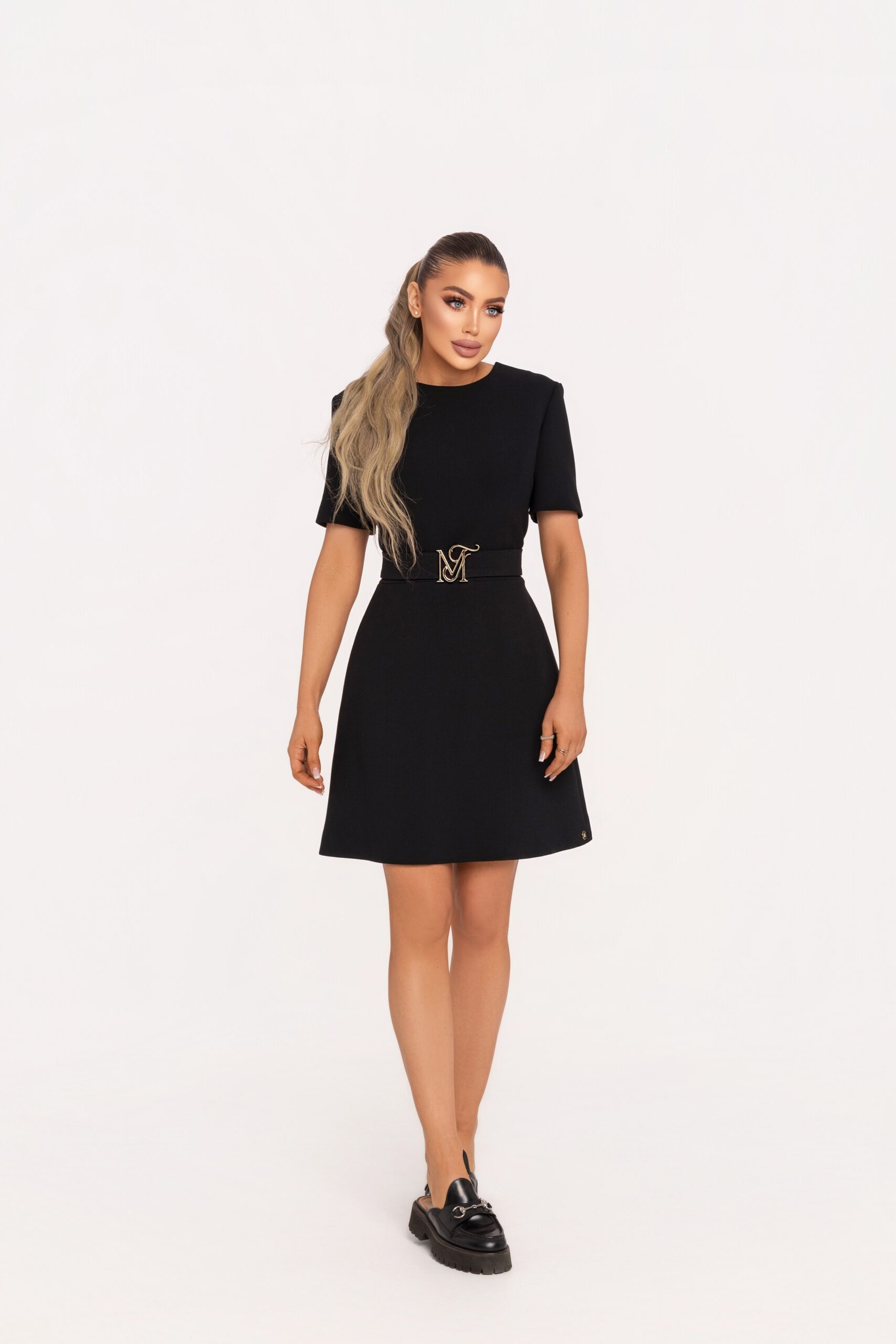 Моделът е с къси ръкави и невидим цип в центъра на гърба за безупречно чиста линия. Декоративният колан с метален акцент добавя модерен характер, а деликатната бродерия по гърба внася фин завършек с висока дизайнерска стойност. Дължината е мини – над коляното, създадена да подчертае краката и да придаде уверен, елегантен силует.