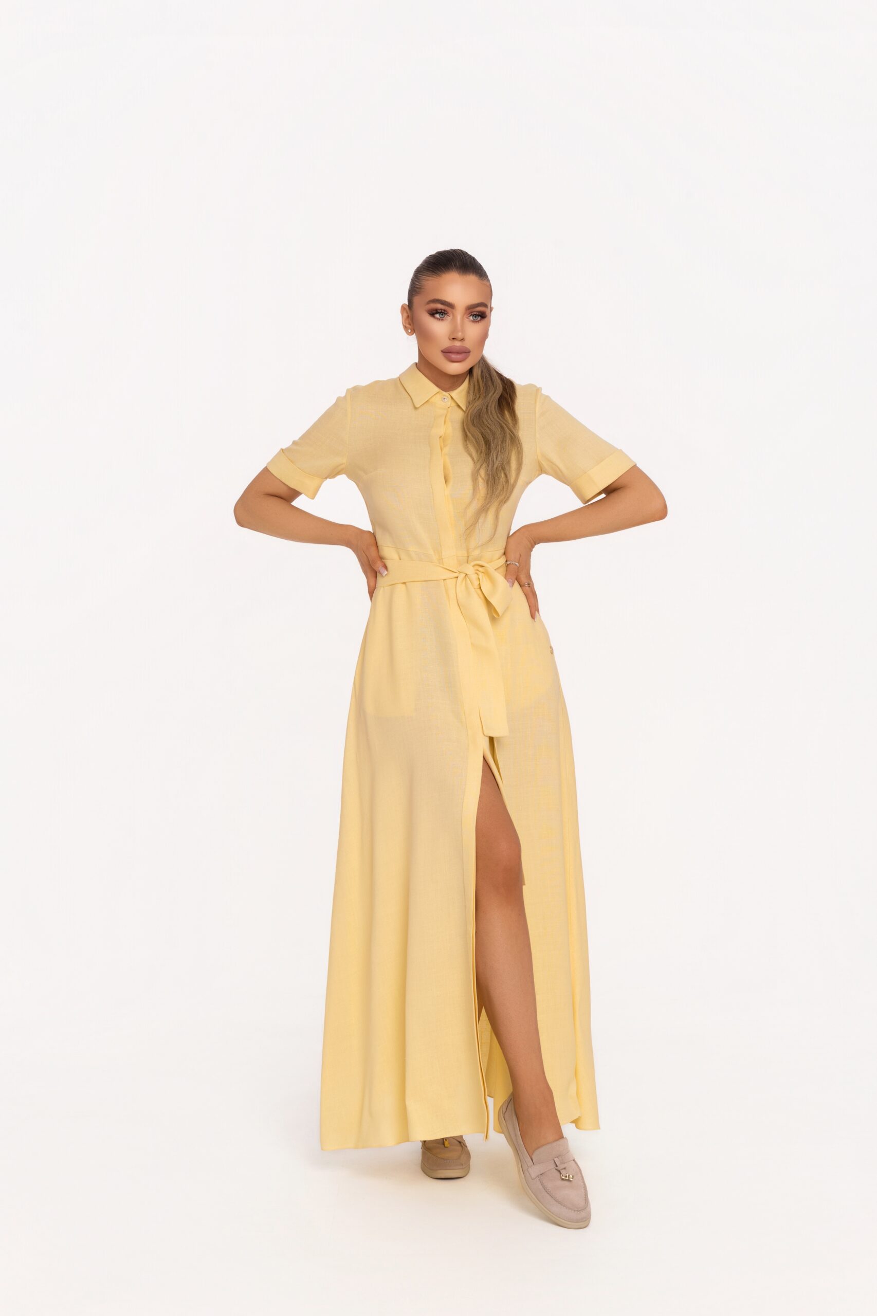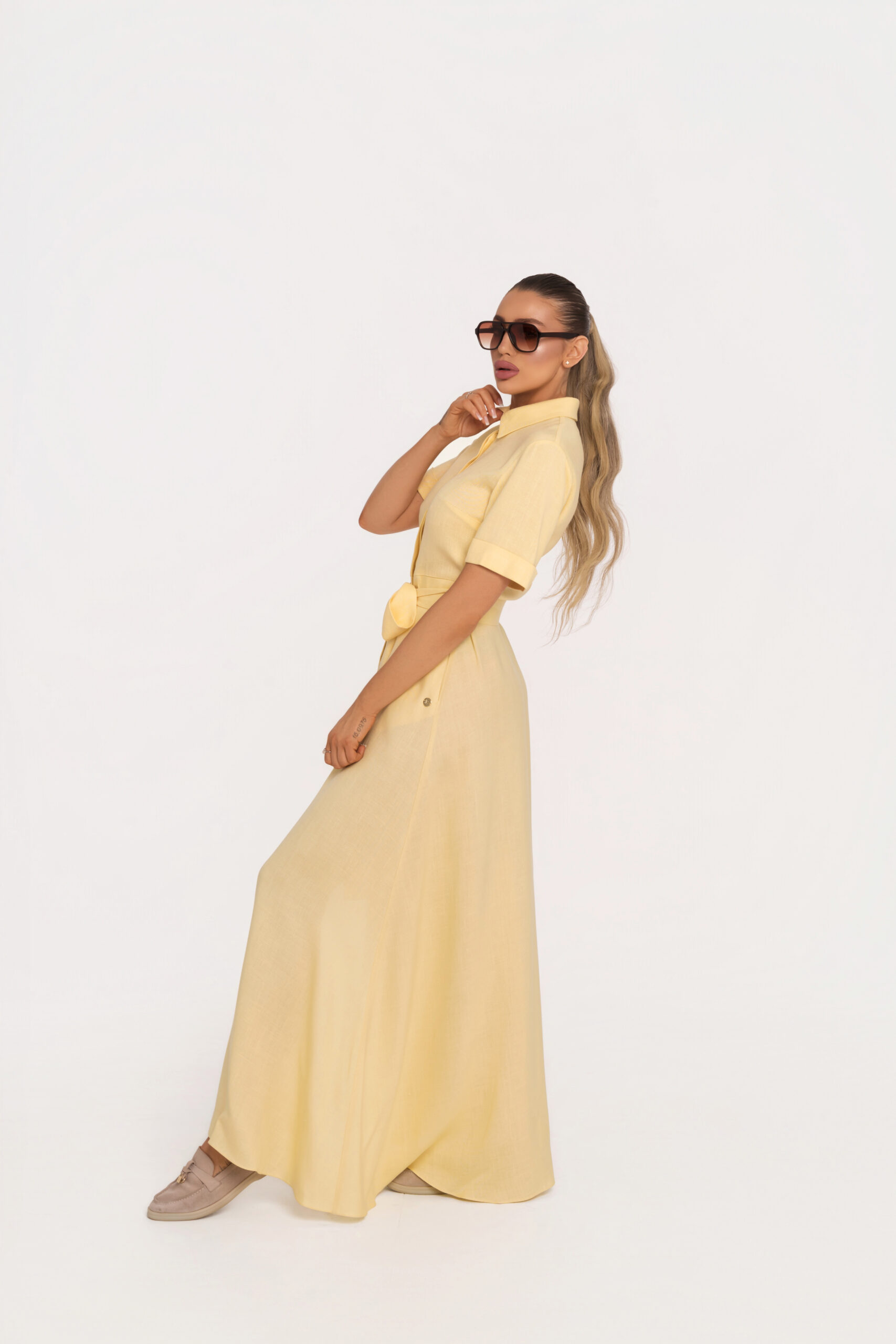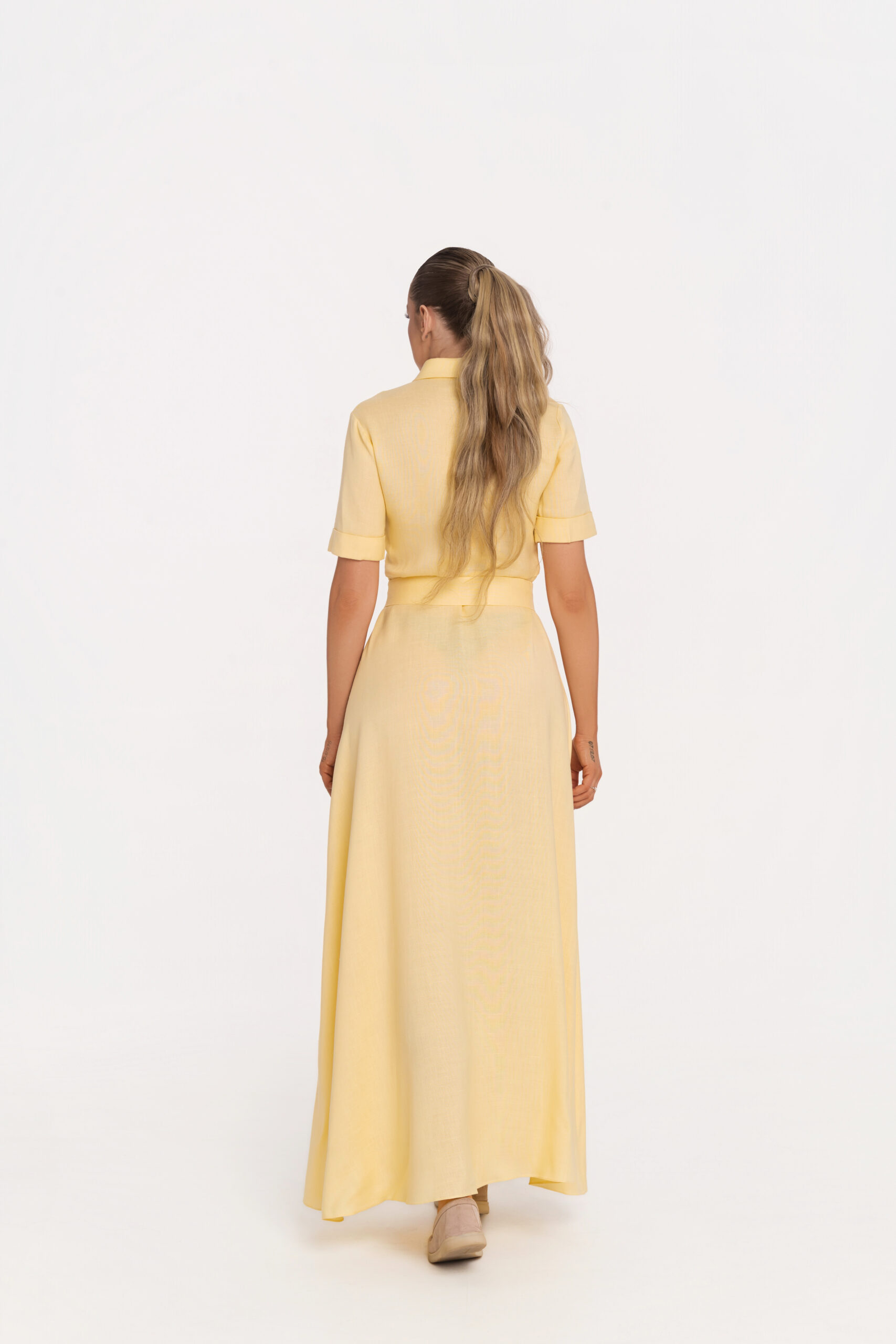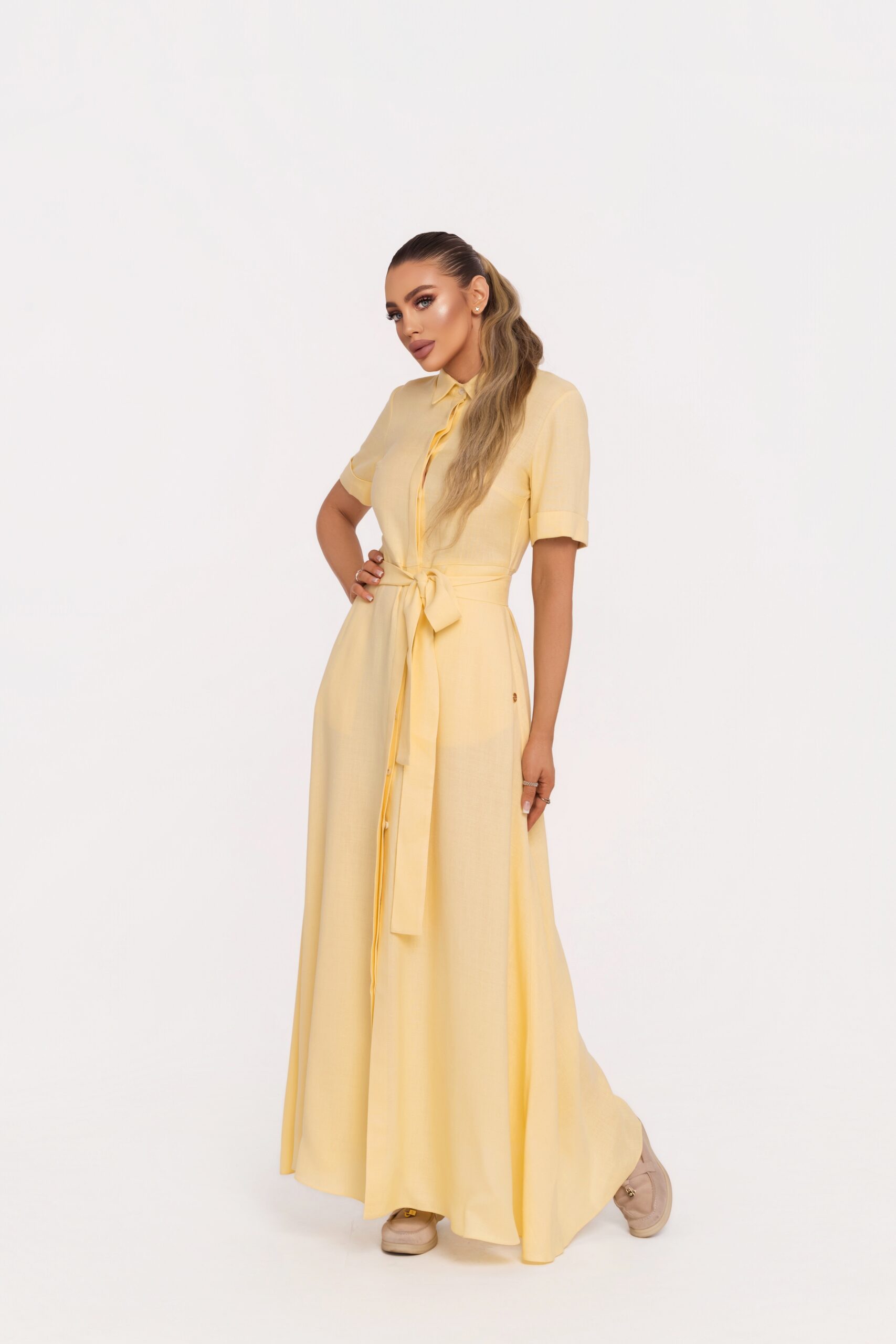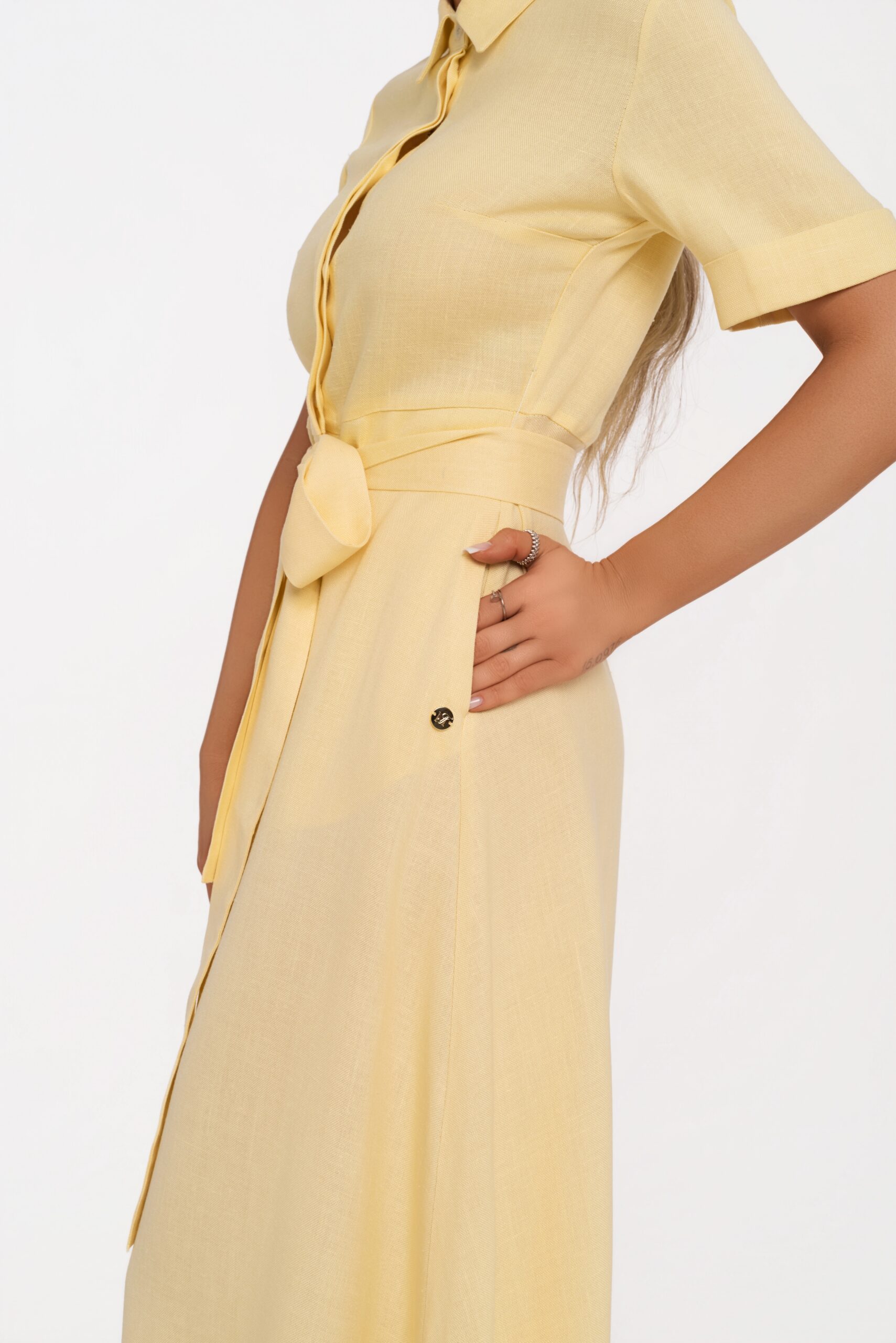 Дълга рокля с A-силует, изработена от 100% висококачествен лен в нежен пастелно жълт нюанс, излъчващ светлина, лекота и изтънчен лукс. Моделът е елегантно завършен с централно предно закопчаване с брандирани копчета, които добавят дискретен акцент към изчистения дизайн.