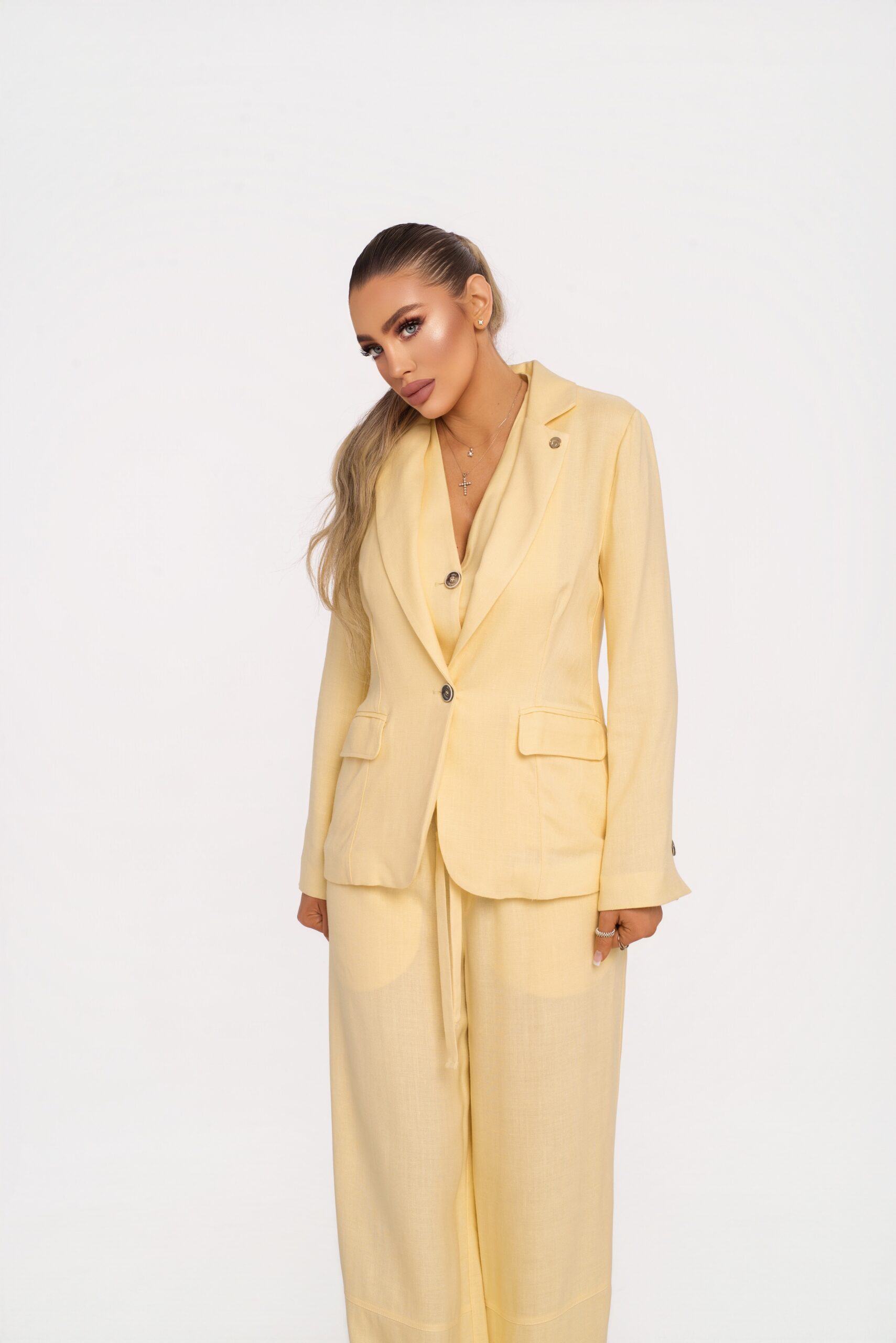 Елегантно скроено сако, изработено от 100% висококачествен пастелно жълт лен, което въплъщава съвременен лукс и безупречна изработка. Моделът се отличава с централно предно закопчаване с брандирани копчета — дискретен, но изразителен акцент. Дългите ръкави и меките реверни линии (soft lapel) придават изтънчена, плавна структура на силуета, докато страничните предни джобове с капаци добавят класическа нотка и функционалност.
