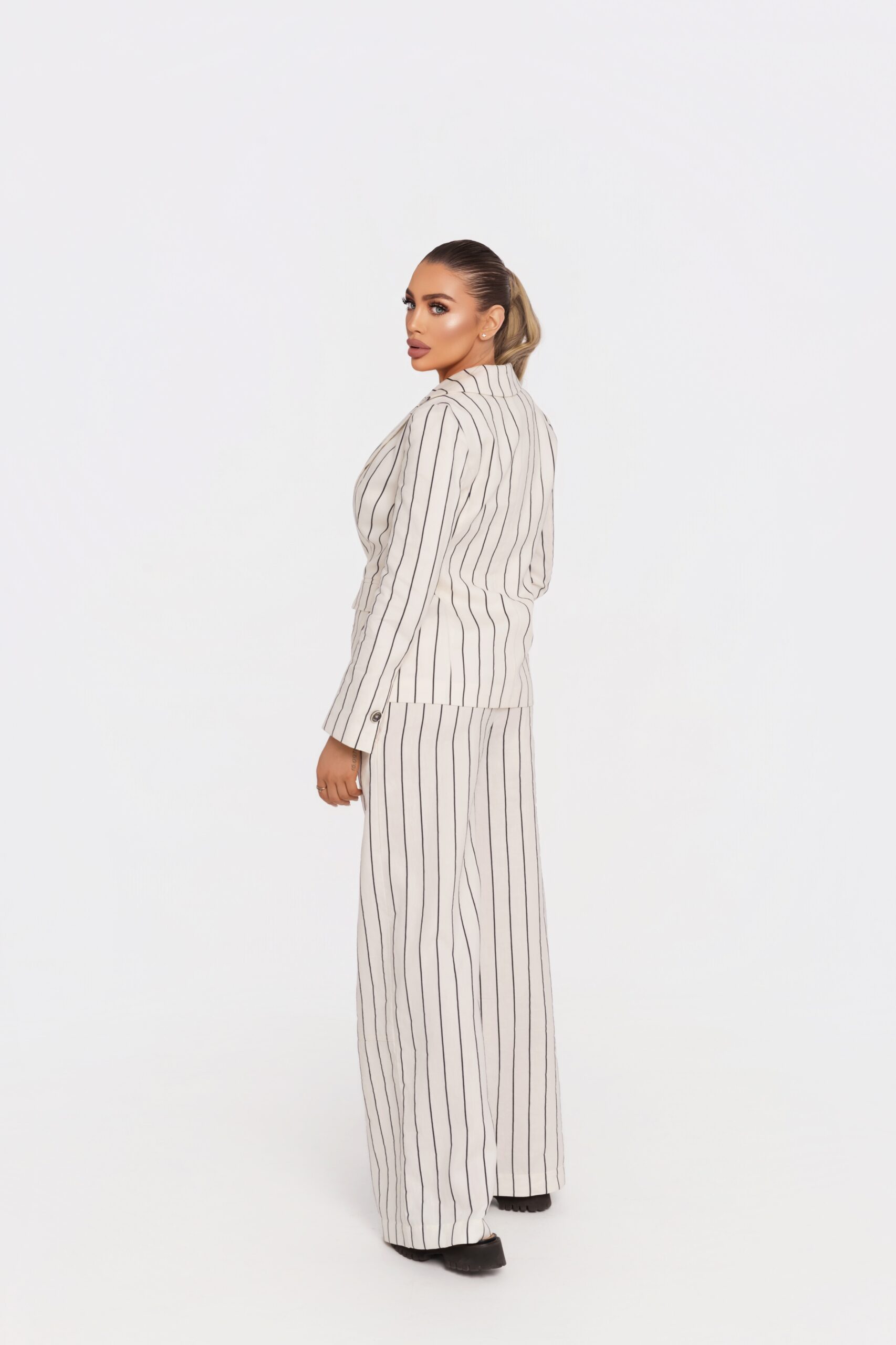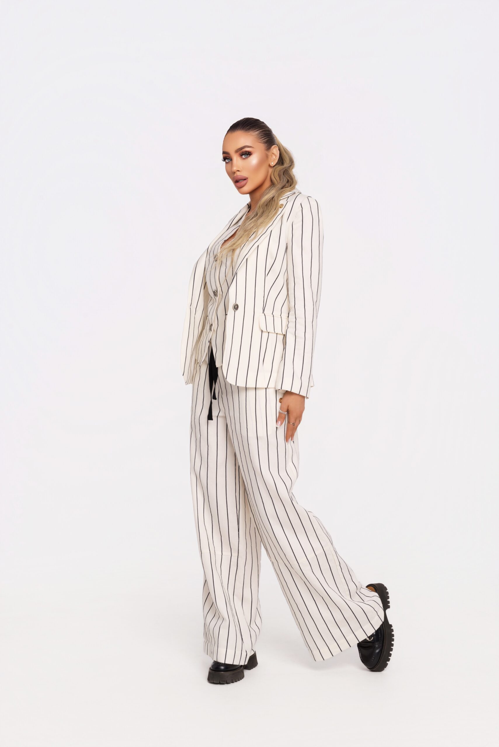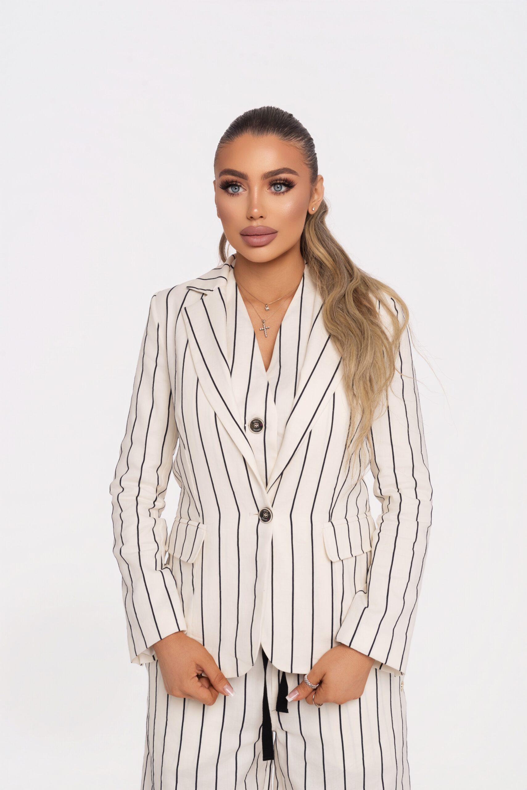 Елегантно скроено сако, изработено от 100% висококачествен бял лен с фини черни райета, което въплъщава съвременен лукс и безупречна изработка.